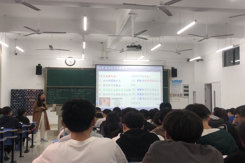 本次活动听课对象为通信教研室钱亚萍老师的《通信专业英语》,授课内容为《Introduction to Digital Signal Processing》。课堂上,钱教师充分运用信息化教学手段,以音乐、视频、图片为媒介,精心设计“歌曲引入、视频分享、专业讲解、学生互动”四个教学环节。结合英语歌曲中的歌词句式,引出本次课的教学重点—非谓语动词,同时将思政元素以谚语、句式翻译等形式有效融入教学。整个课堂气氛活跃,全体学生积极参与互动,教学效果良好。